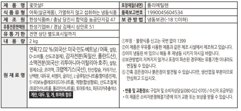 한성 꽃맛살F (7.5g*267±5개입) 2Kg 냉동 이미지