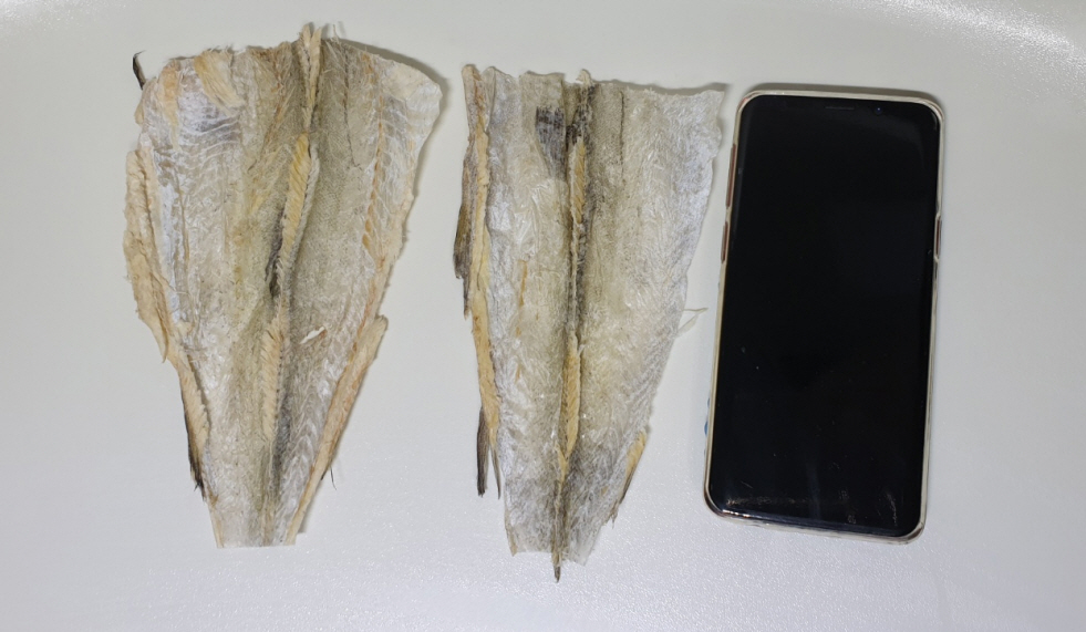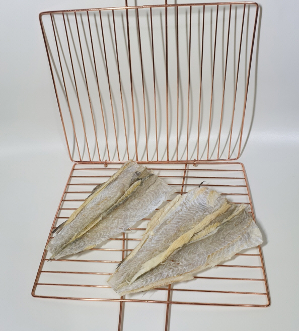 먹태의 머리와 꼬리가 없는 껍질 두 장을 같이 넣어드려요. 두 접시로 플레이팅 할 수 있습니다.