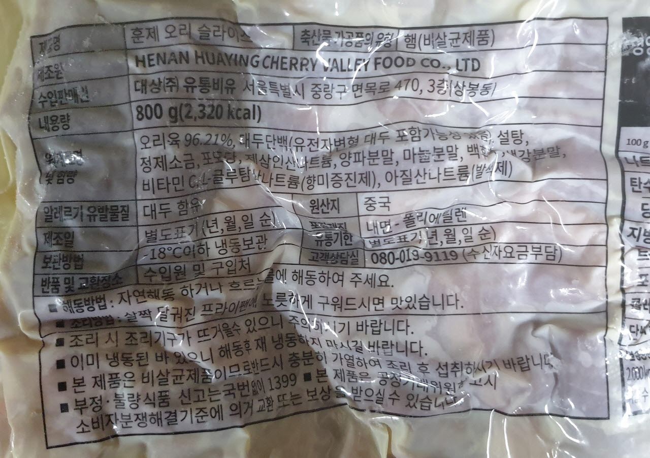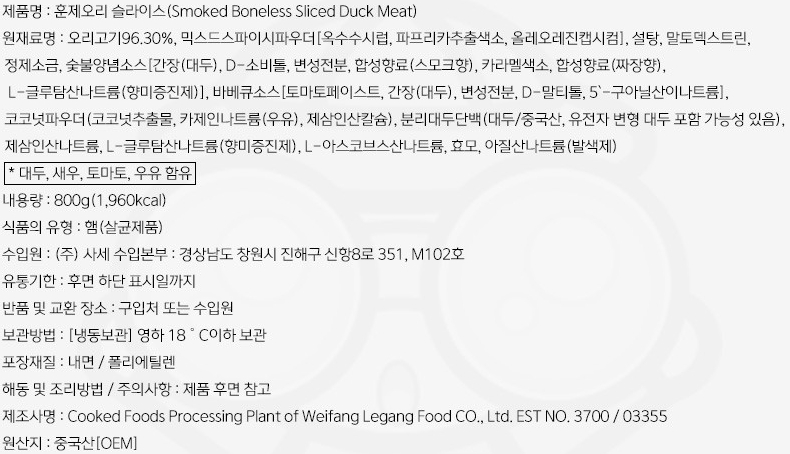 현재 훈제 오리 슬라이스 800g 제품은 두가지가 병행해서 출고되고 있습니다.