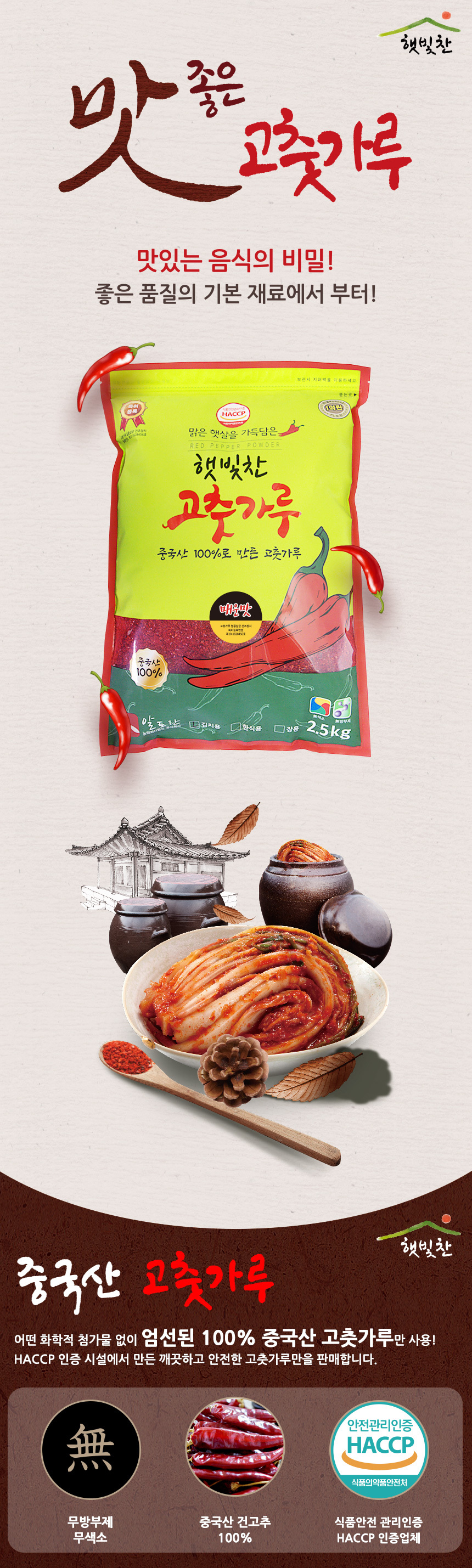 ![100%국내생산 햇빛찬 고춧가루 고추가루 2.5kg (김치용, 매운맛) [냉동초 중국산] 이미지](https://content.foodspring.co.kr/vendor/1303/images/108_9119164320_r.jpg?f=webp&s=876x876&t=inside)