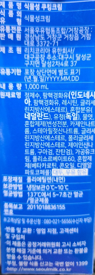 서울우유 식물성쿠킹크림 1000ml