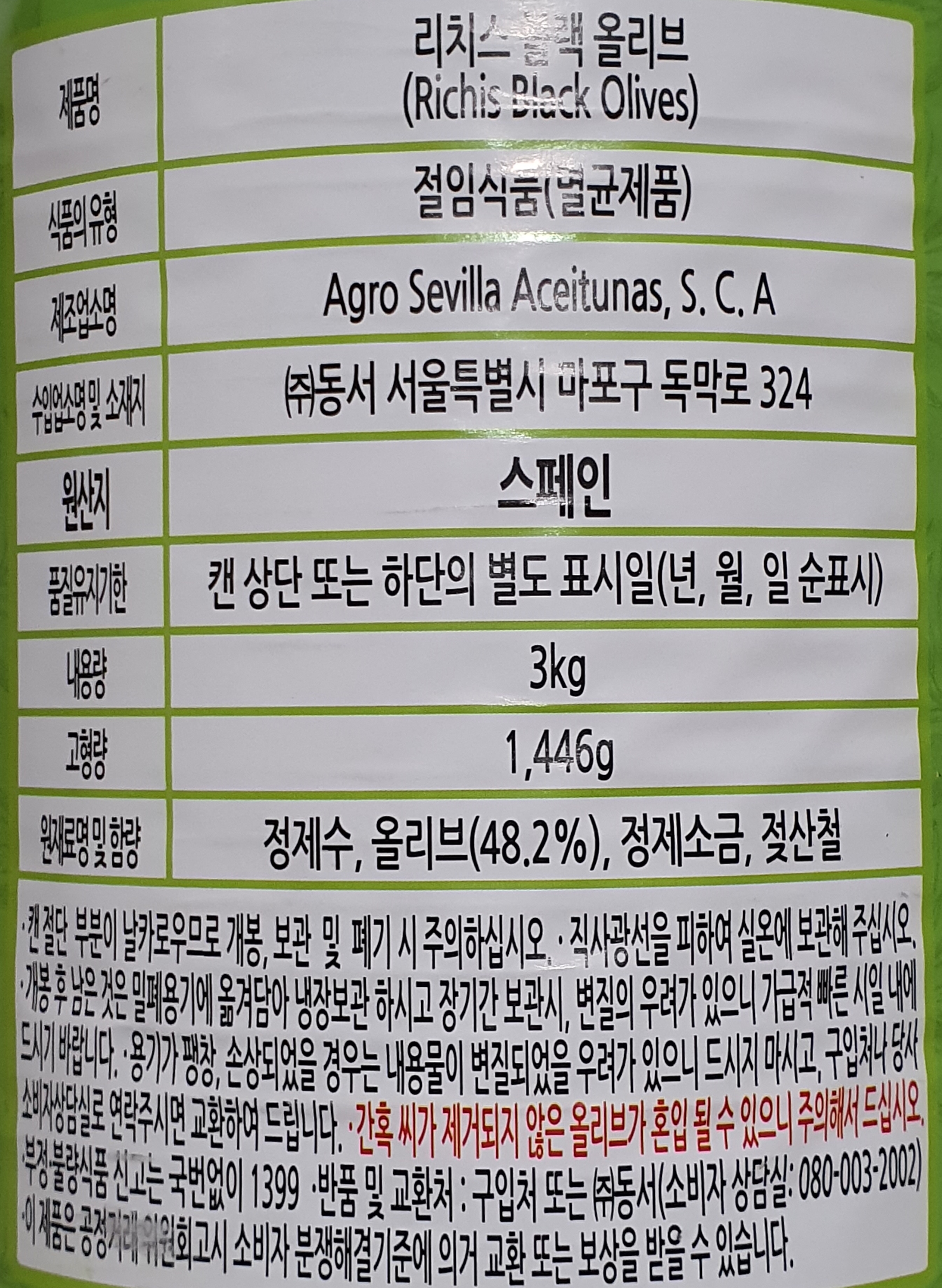 리치스 블랙올리브 홀 3kg 캔 통조림 이미지