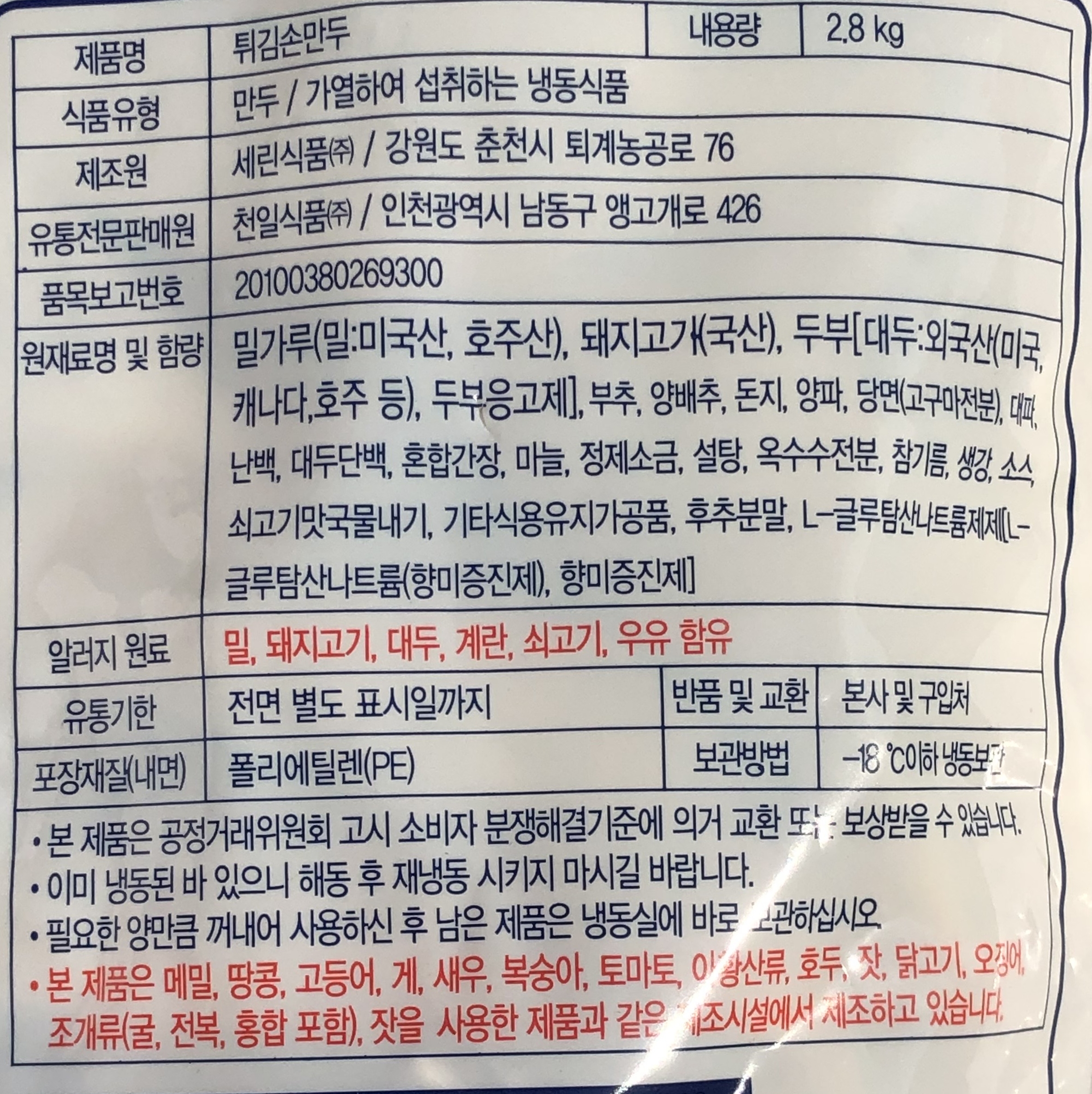 천일 튀김 손 만두 2.8kg 담두