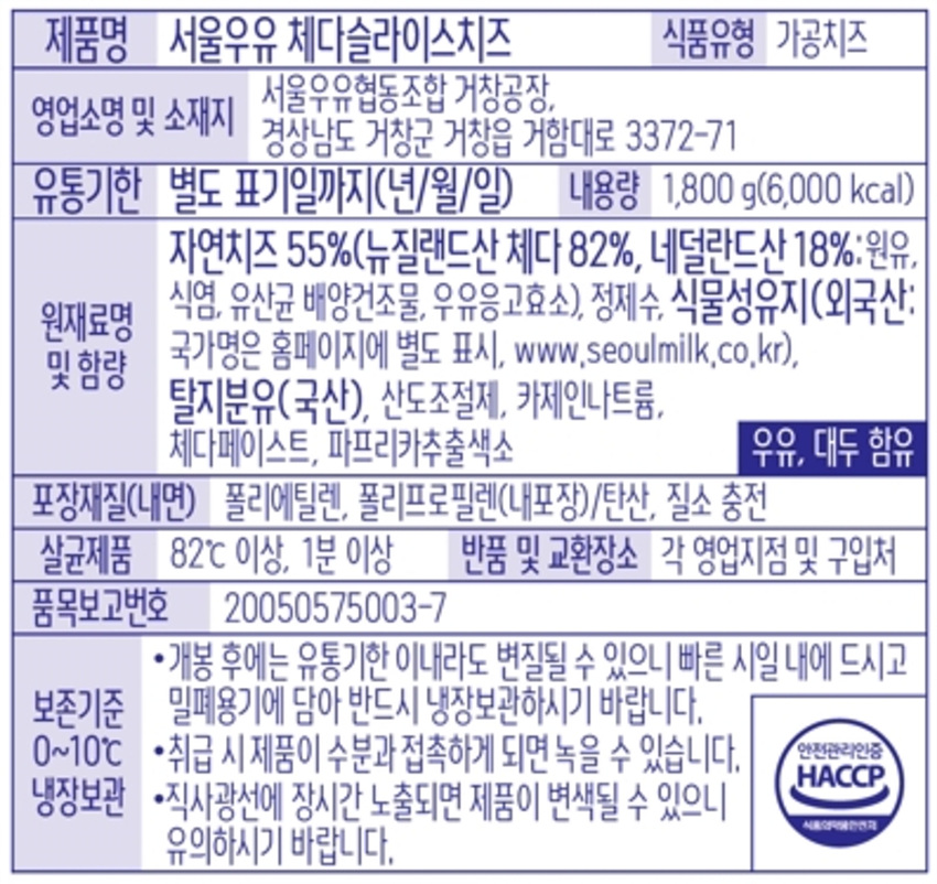 서울우유 체다치즈(슬라이스_18g*100입 1.8Kg/EA)