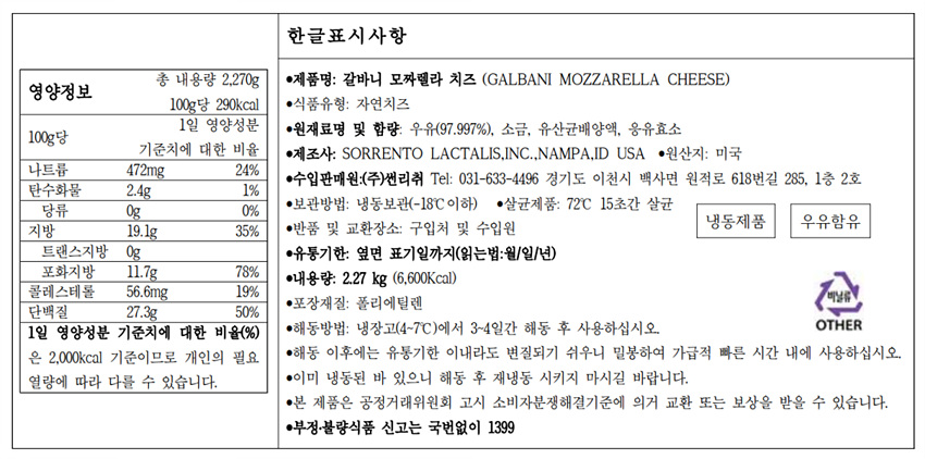 갈바니 모짜렐라치즈(블럭 2.27Kg/EA)