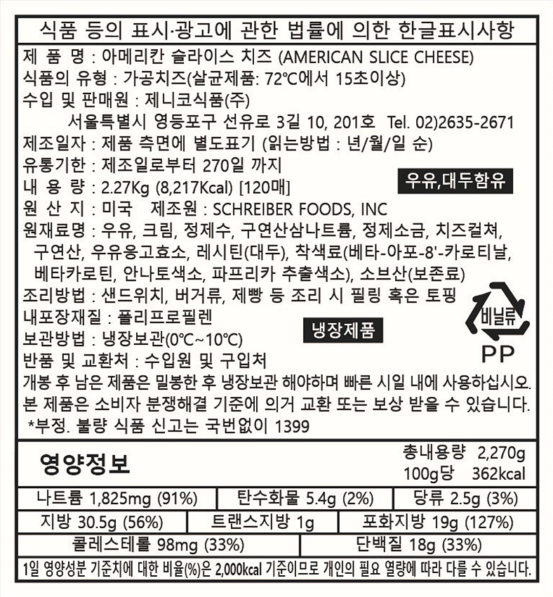 ★파격특가★ 슈라이버 아메리칸슬라이스치즈(SOS_120매입 2.27Kg/EA)