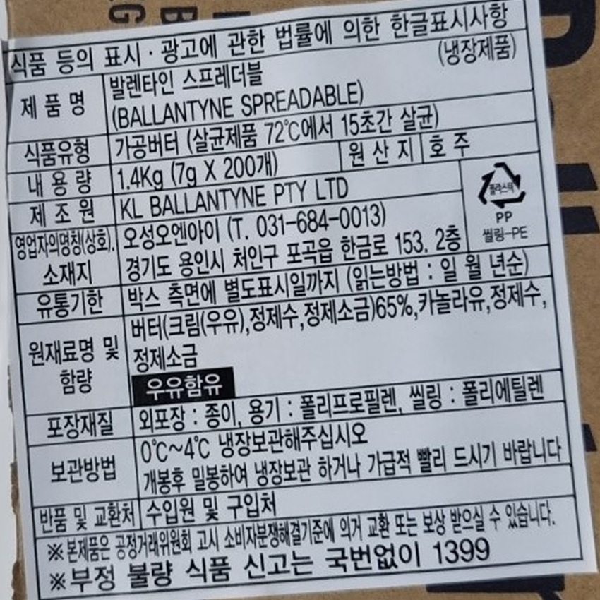 발렌타인 포션버터(7g*200입 1.4Kg/BOX)