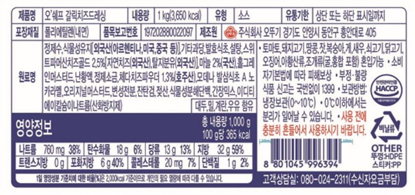 오뚜기 갈릭치즈드레싱C(1Kg/EA) 소스