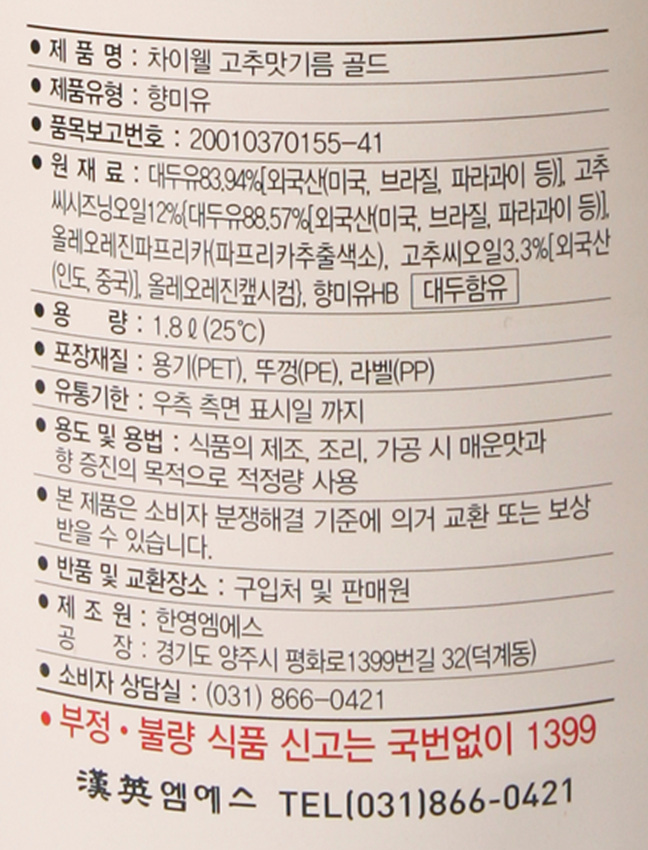 차이웰 고추맛기름(골드_1.8L/EA) 고추기름