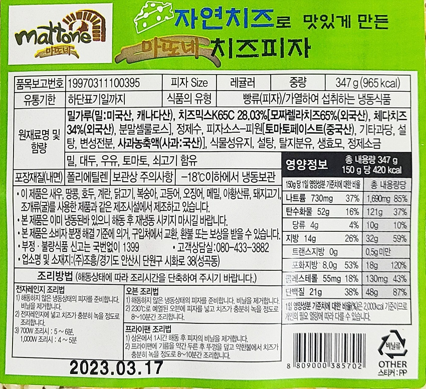 조흥 마또네치즈피자(원형 347g/EA) 이미지