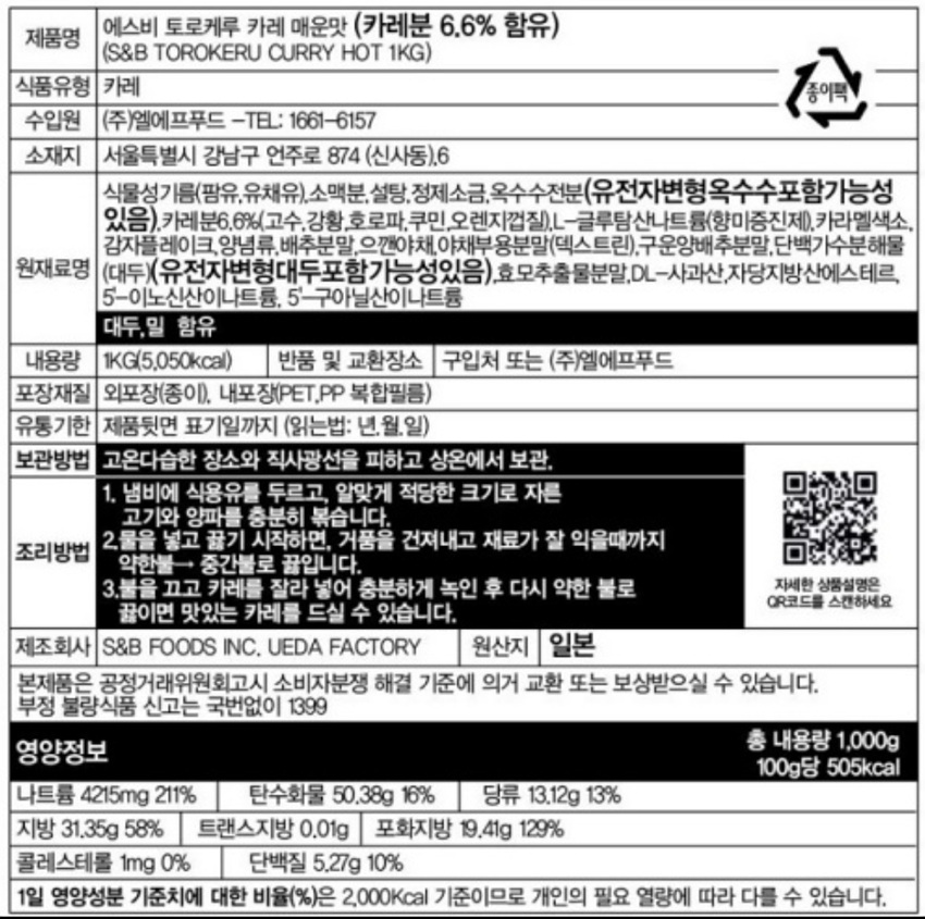 토로케루 매운맛카레(고형 1Kg/EA) 커리