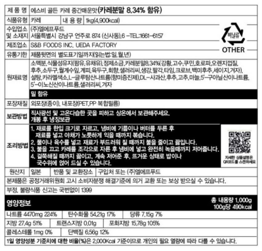 S&B 카레(골든 중간매운맛 1Kg/EA) 커리