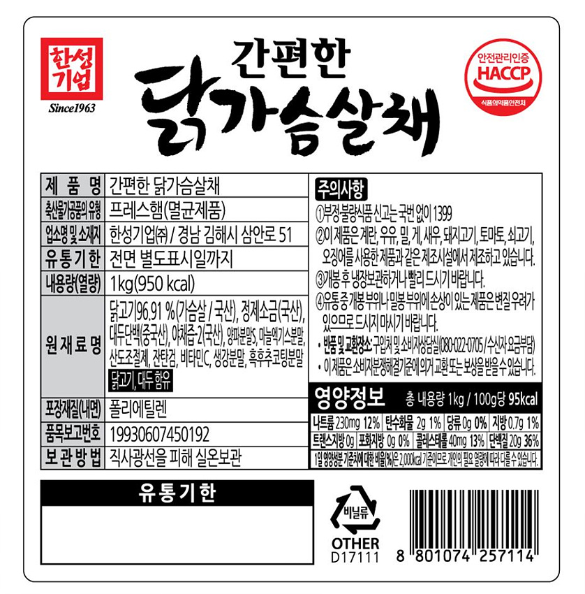 한성 닭가슴살(채 1Kg/EA)