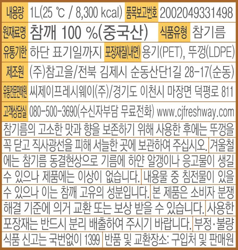 이츠웰 더진한참기름(골드 통참깨 PET 1L/EA)