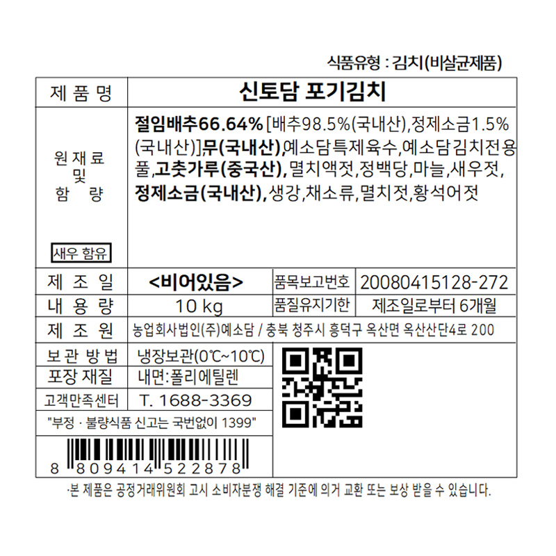 신토담 포기김치(약숙_일반 10Kg/BOX) 업소용 반찬 예소담