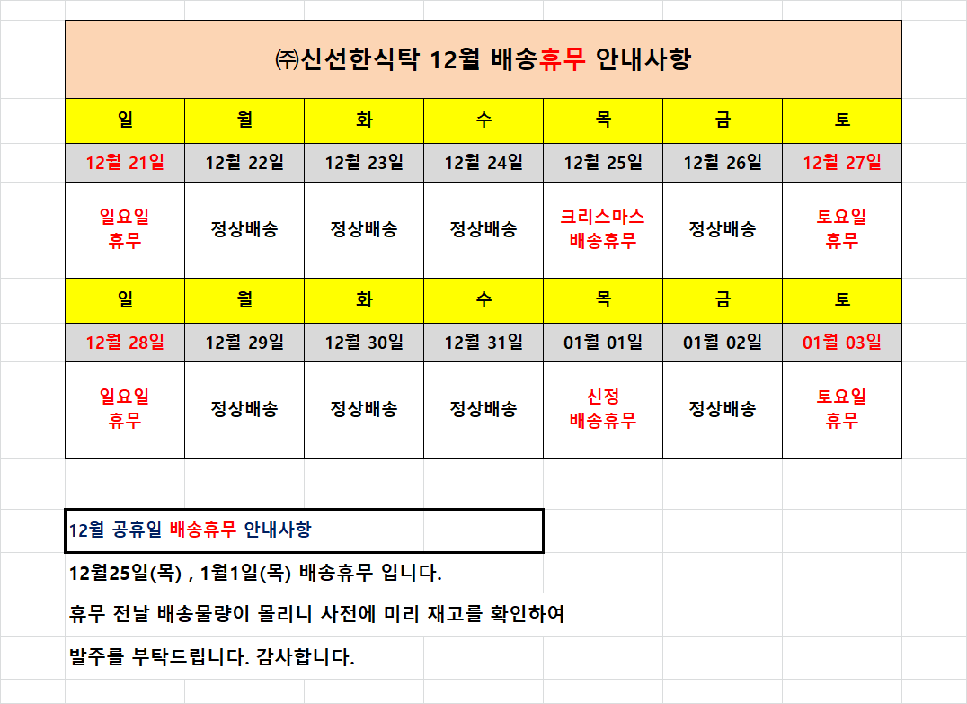 금요일(새벽시간 기준) 배송이 불가하오니, 꼭 참고하시어 발주를 부탁드리겠습니다.