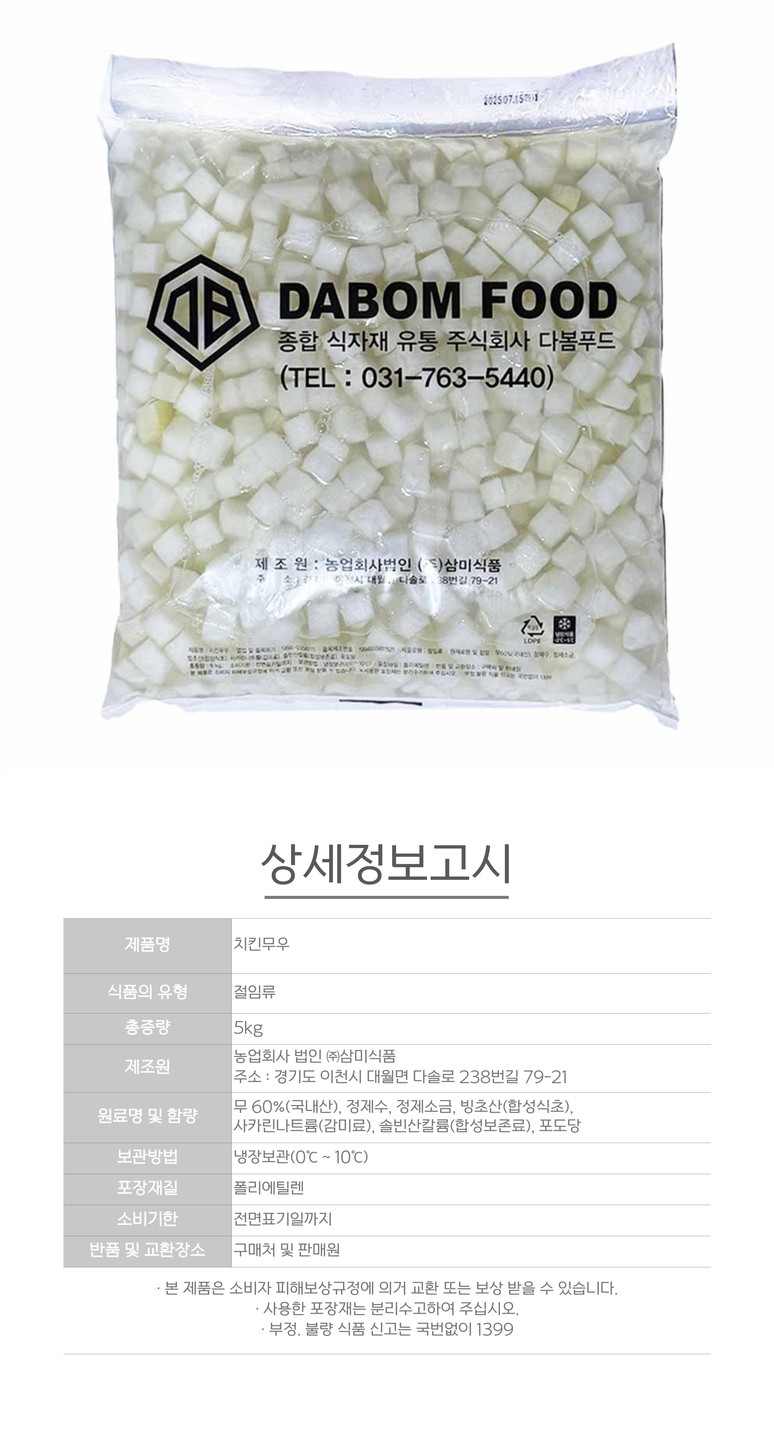 다봄 치킨무 5kg 대용량 업소용 봉지무 이미지