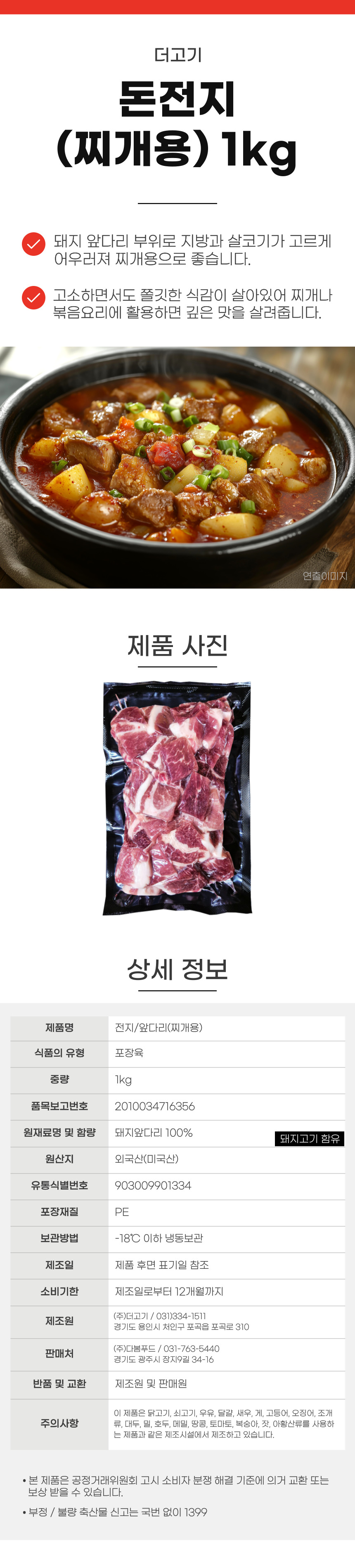 찌개용 전지(앞다리) 1kg (0.9mm/가세3cm) 돼지고기 이미지