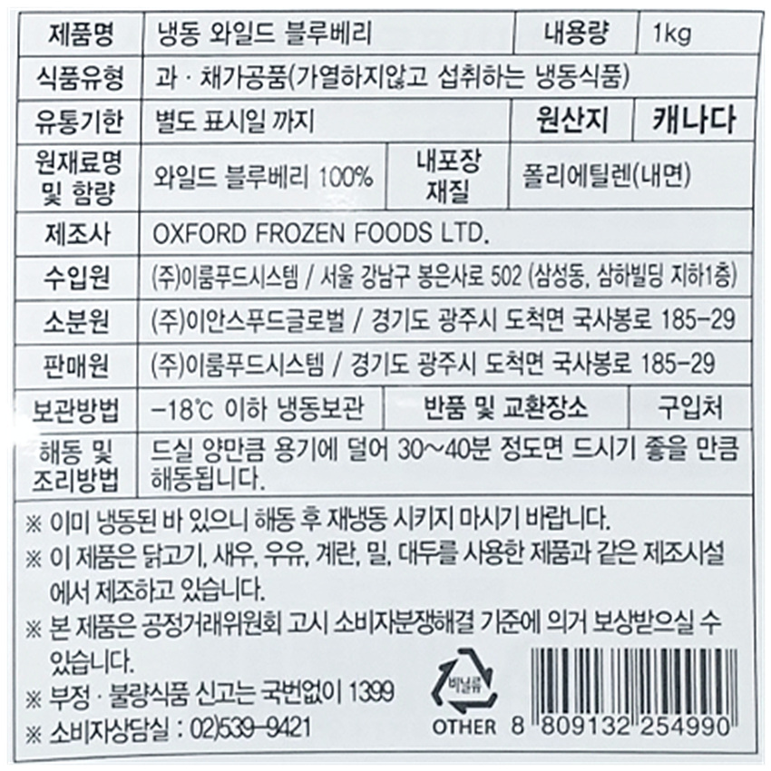 냉동 블루베리(와일드_8mm 1Kg/EA)/캐나다산
