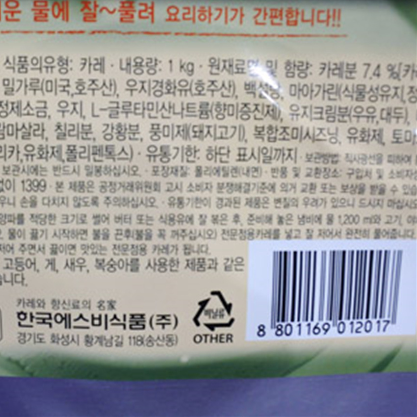 한국에스비 카레분말(약간매운맛 전문용 1Kg/EA) 커리 이미지