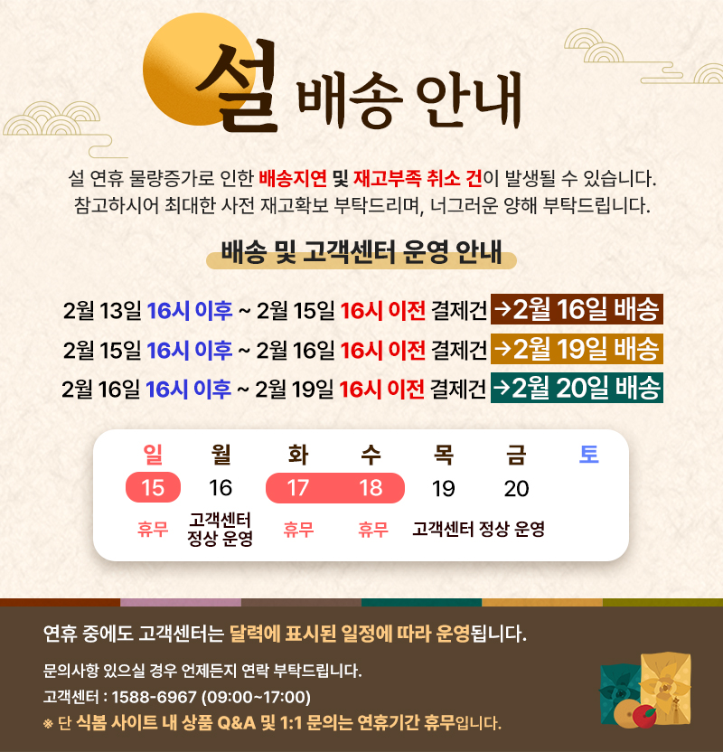 • 택배배송의 경우, 주말 및 공휴일 전일 및 당일에는 상품 발송이 어려울 수 있습니다.