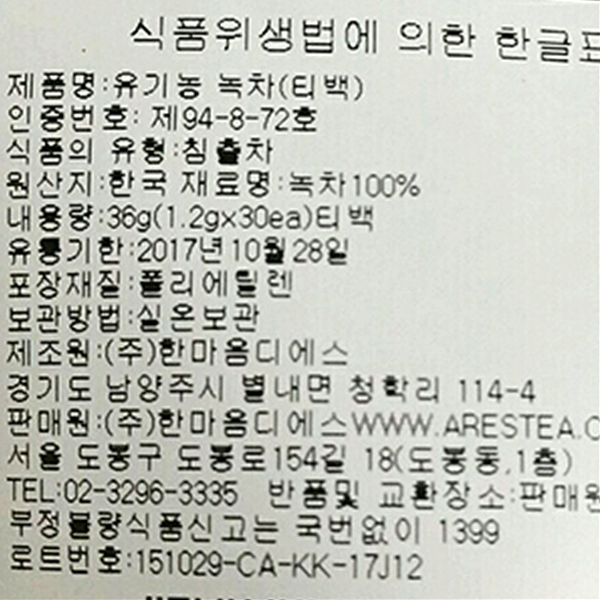아레스 녹차(1.5g*30T_유기농 45g/EA) 이미지