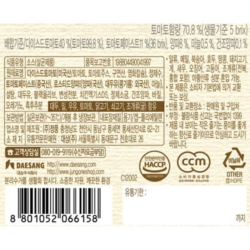청정원 구운마늘과양파토마토스파게티소스(2Kg/EA) 이미지