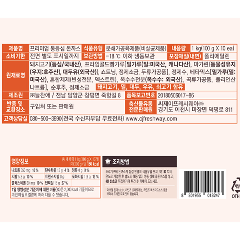 이츠웰 프리미엄 통등심돈까스(100g*10입 1Kg/EA)