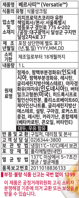 베르사띠 휘핑크림(1L 1Kg/EA)식물성 쿠킹 크림 생크림
