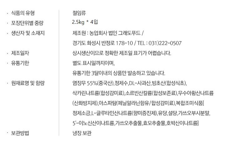 본 제품은 제품입고일별 유통기한 또는 품질유지기한이 상이하므로, 필요시 고객센터로 문의하여 주십시오. 제조일로부터 180일 까지