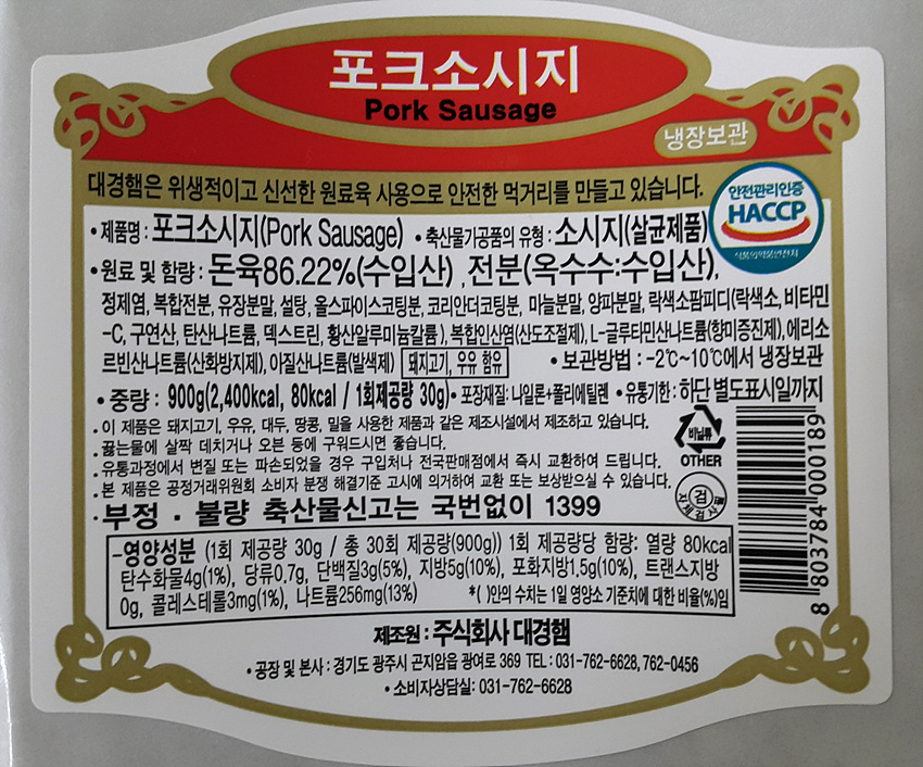 대경햄  소시지(포크 900g/EA) 소세지 이미지