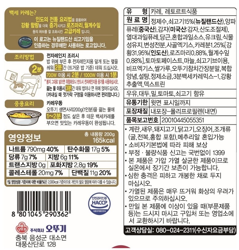 오뚜기 백세카레(약간매운맛 1Kg/EA) 커리 이미지