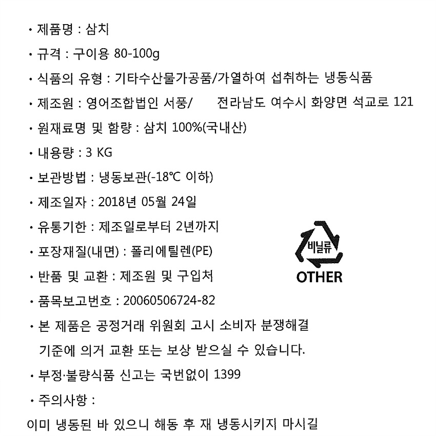 삼치(80~100g/토막 구이용 3Kg/EA)/국내산 이미지