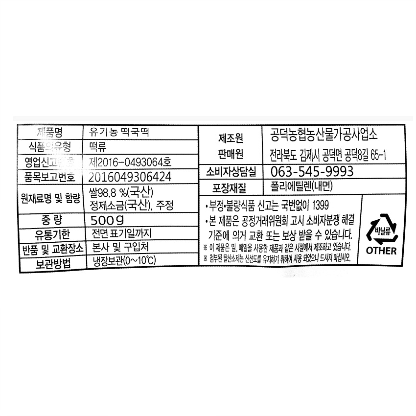 공덕농협 쌀떡국떡(유기농 500g/EA)