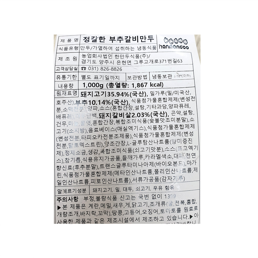 한만두 정갈한부추갈비만두(22±1g*45입 1Kg/EA)