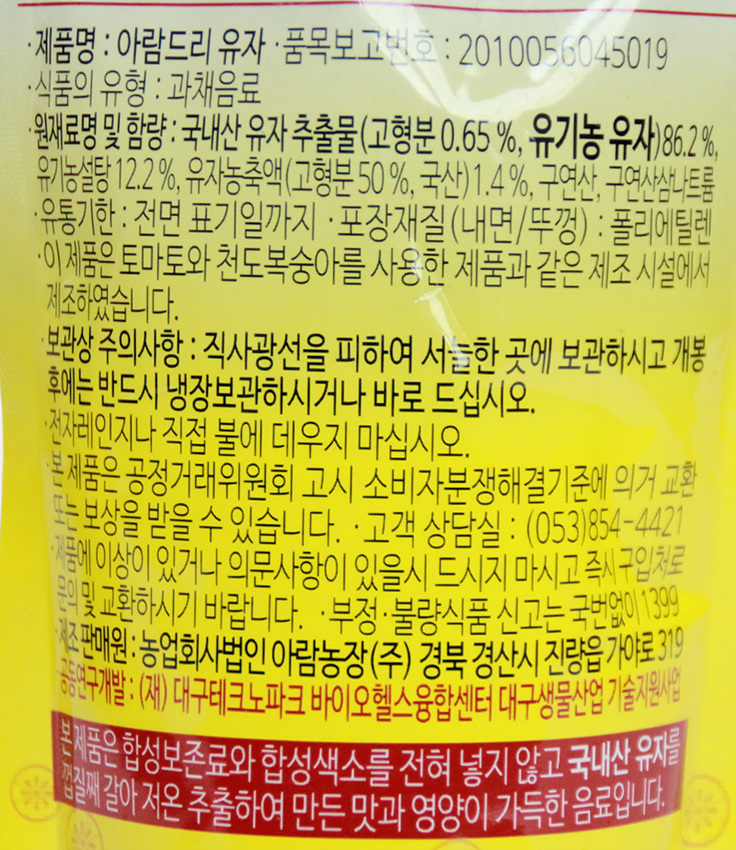아람농장 아람드리유자주스(138ml_유기농 138g/EA)