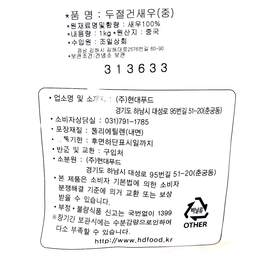 현대푸드 두절건새우(중 1Kg/EA)/중국산