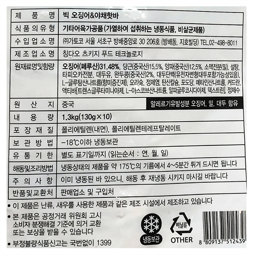 가토코 오징어야채핫바(130g*10개입 1.3Kg/EA)