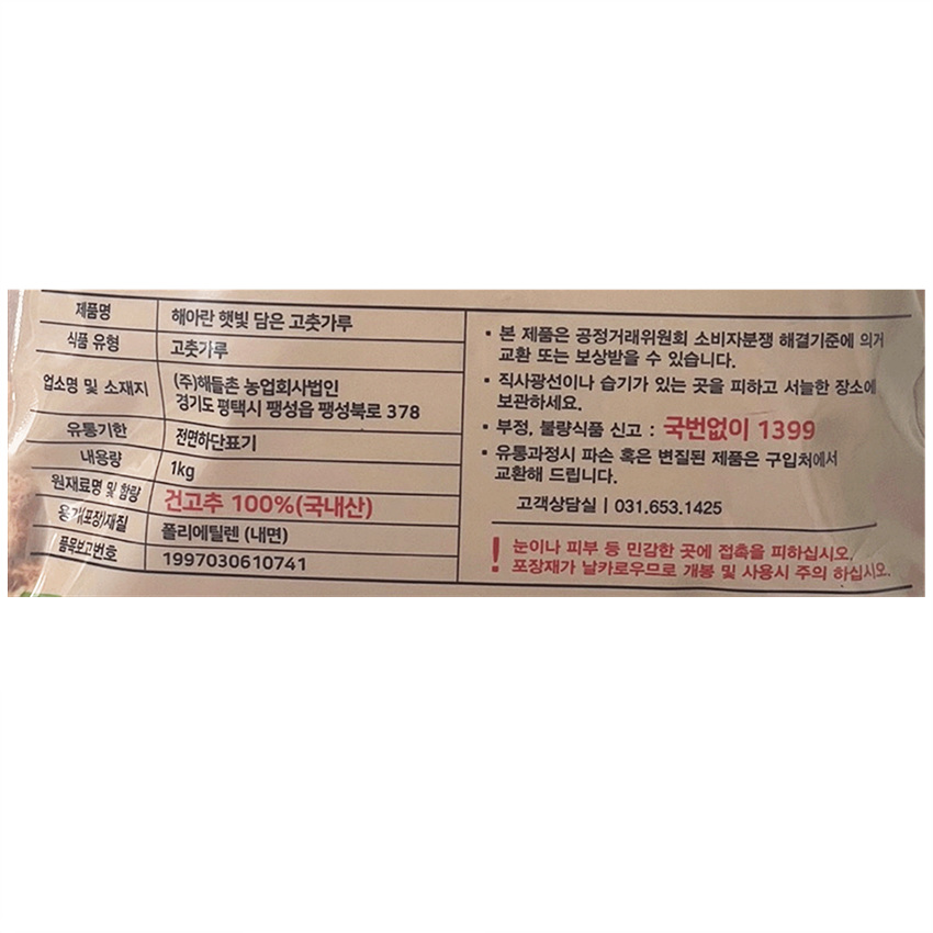 해아란 햇빛담은고춧가루(굵은,김치용 1Kg/EA) 국내산