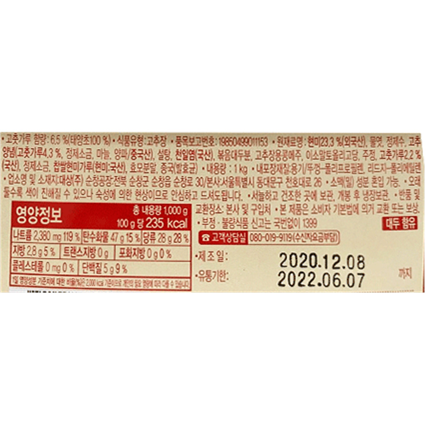 대상 태양초 고추장(100%현미_덜매운 1Kg/EA) 이미지