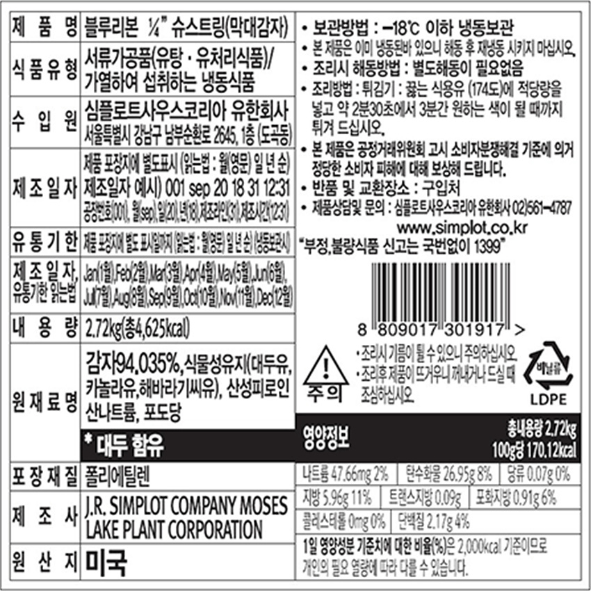 심플로트블루리본 냉동감자(슈스트링 2.72Kg/EA) 감자튀김