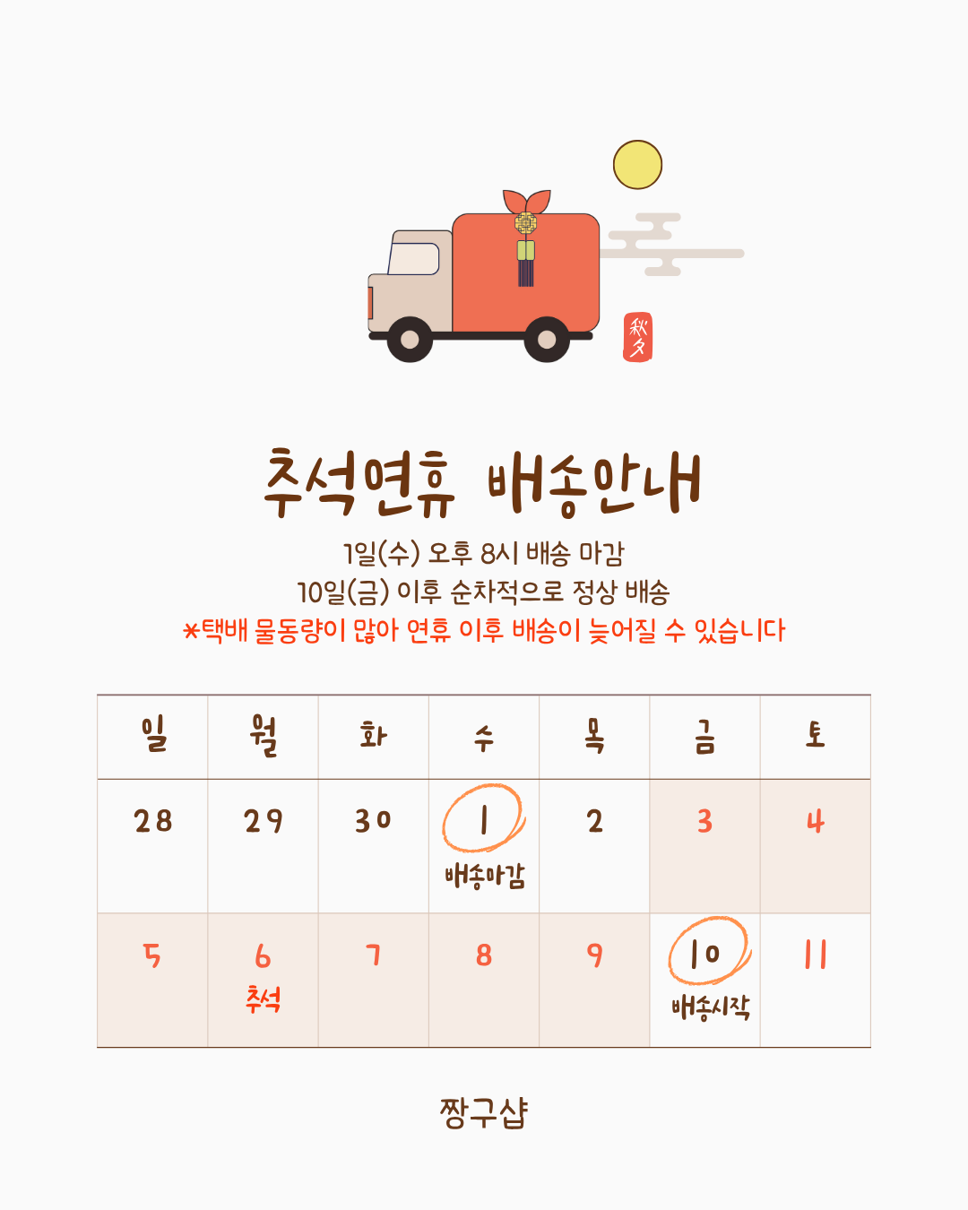 • 택배배송의 경우, 주말 및 공휴일 전일 및 당일에는 상품 발송이 어려울 수 있습니다.