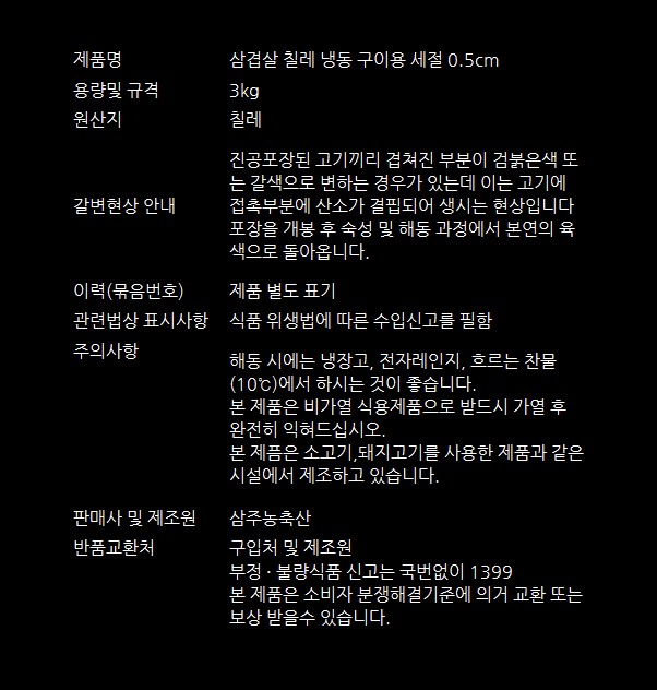 삼겹살 칠레산 (0.8cm세절) 3kg 내외 냉동