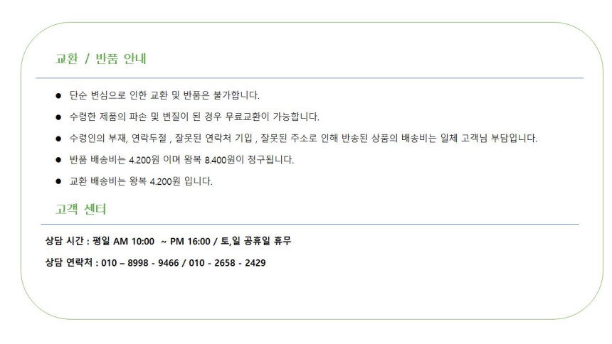3.클레임 (반품,교환 등) 수령 후 24시간 이내에 문의 및 접수 해주셔야 처리 가능합니다.