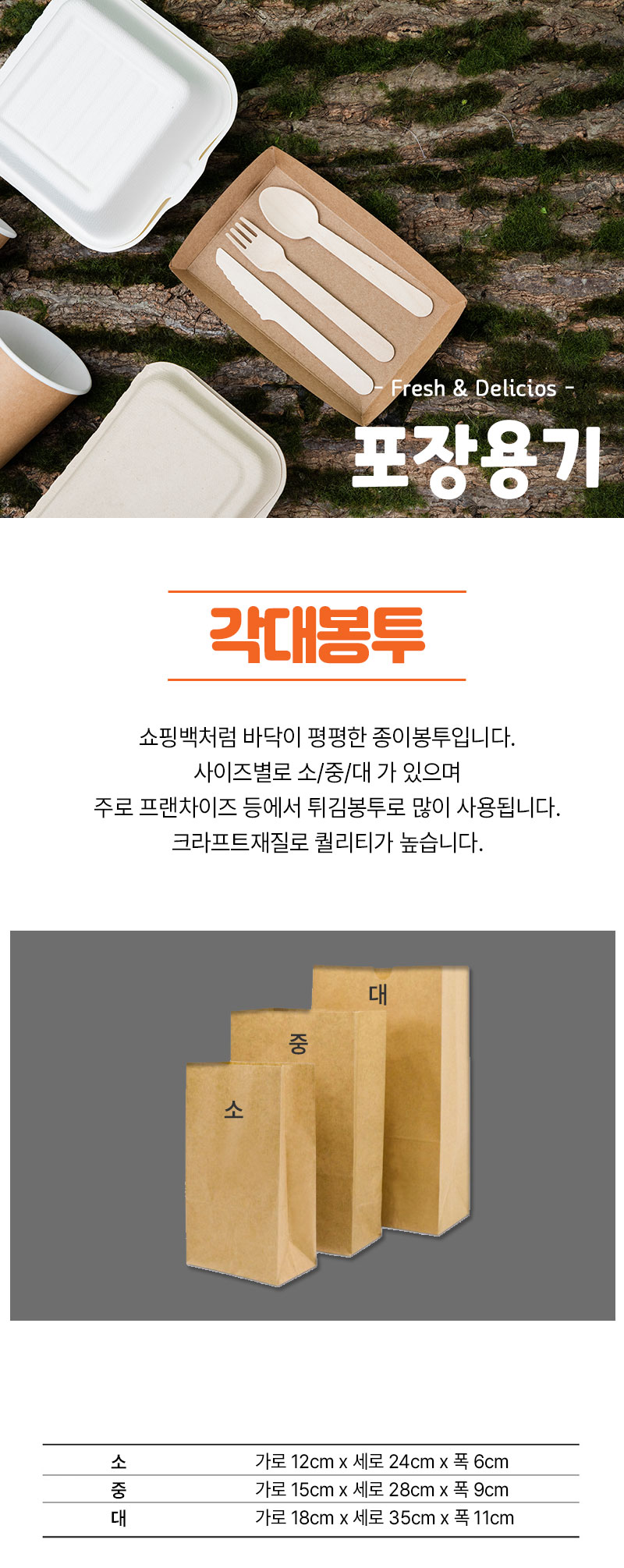 간단설명 : 사이즈별로 소/중/대 가 있으며 바닥이 평평한 크라프트 종이봉투입니다.
