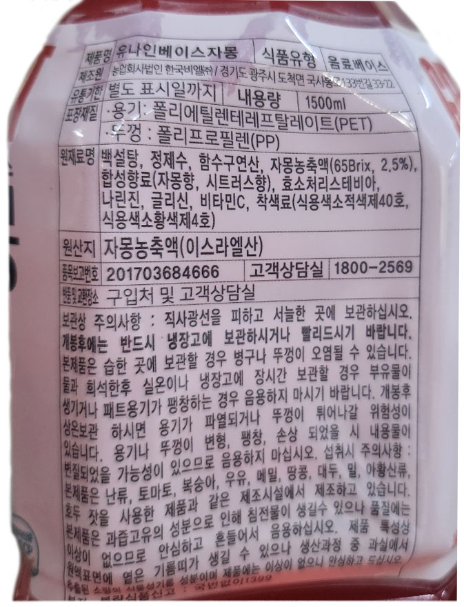 유나인 자몽 베이스 1.5L 원액 엑기스 이미지