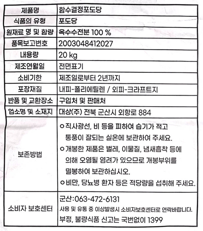 대상 함수결정포도당 20kg입니다.