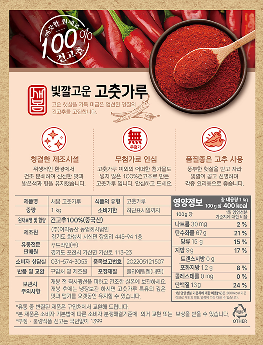 새봄 고춧가루 1kg (고움,중식,매운) 고추가루