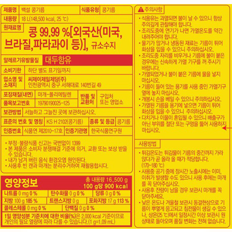 백설 대두유(18L 16.506Kg/EA) 식용유 이미지