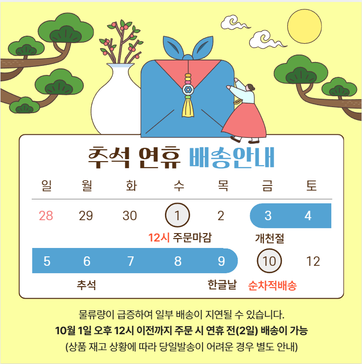 • 택배배송의 경우, 주말 및 공휴일 전일 및 당일에는 상품 발송이 어려울 수 있습니다.